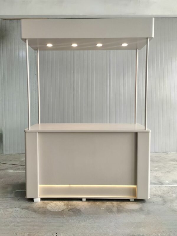 Verkauft wird ein stilvoller Marktstand in macchiato Beige mit den Maßen 180×80×250 cm. Der Stand überzeugt durch sein zeitloses Design, bietet großzügige Fläche und wird durch seine klare, helle Farbe zum eleganten Blickfang auf jedem Event.