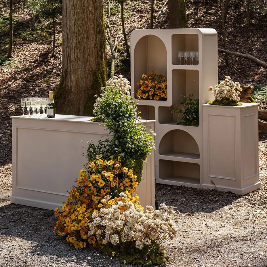 Die mobile Bar-Säule ist nicht nur ein praktischer Hingucker, sondern auch unglaublich flexibel. Sie lässt sich problemlos an verschiedenen Stellen des Events platzieren – sei es als elegante Getränkestation, für Snacks oder als Dekotisch. Mit ihrer kompakten Größe ist sie auch ideal für kleinere Räumlichkeiten oder als zusätzlicher Akzent neben größeren Barbereichen. Die schlichte macchiato beige Oberfläche bietet zahlreiche Möglichkeiten zur Dekoration und personalisierten Gestaltung, sei es mit Blumen, Lichtern oder anderen kreativen Ideen.